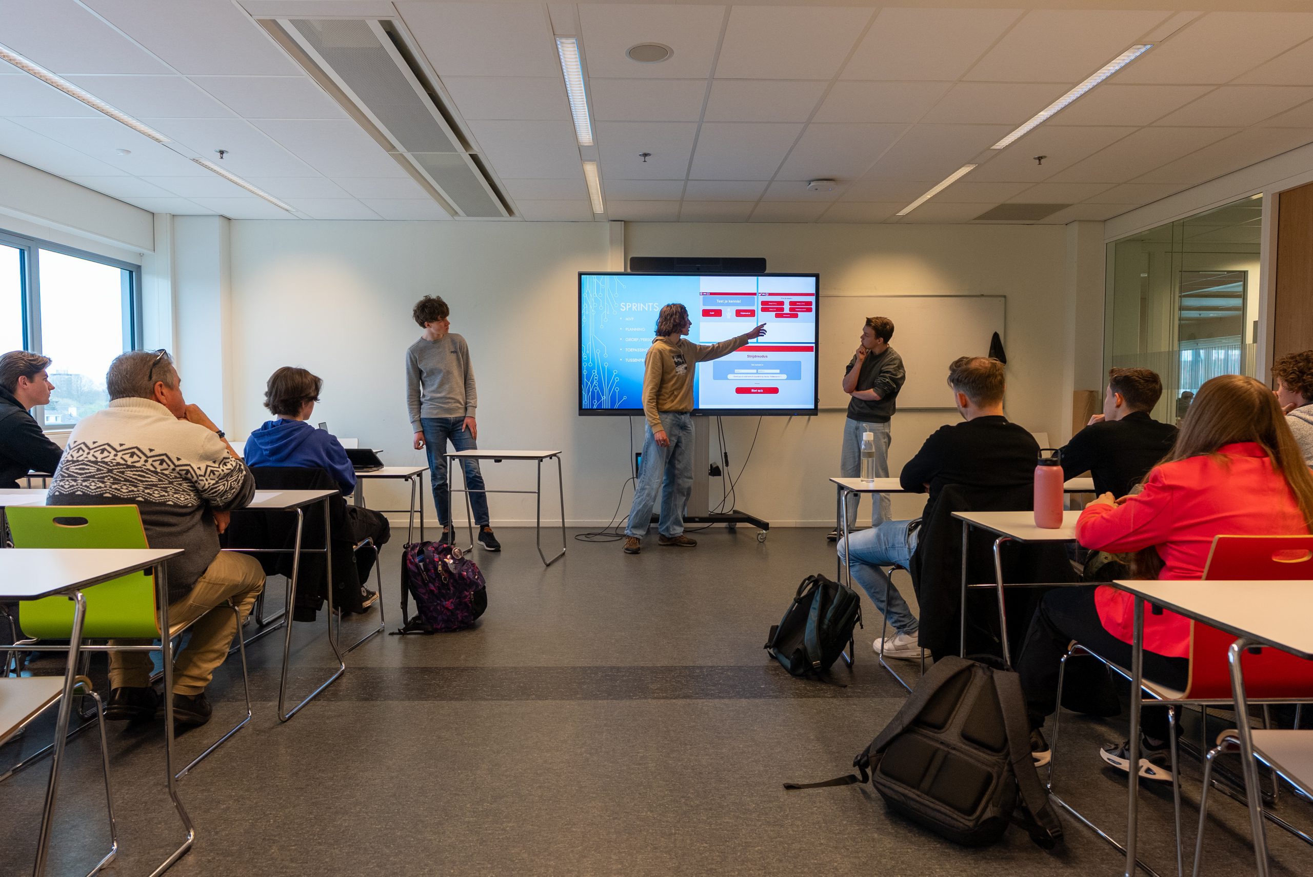Er waren ook prijzen te winnen. ’s Ochtends won het ‘groepje van Roos’ de prijs voor beste havoproduct met een handige webapplicatie voor docenten en leerlingen. Met deze applicatie kunnen ze bij het vak natuurkunde eenvoudig en overzichtelijk alle sets met Arduino-onderdelen beheren. ’s Middags behaalden Tim en Ties een gedeelde eerste plaats bij de vwo-projecten met hun app die hulpbehoevende kinderen helpt bij dagelijkse routines, inclusief ouderportaal. Hiermee lieten ze zien dat ze niet alleen technisch sterk zijn, maar ook goed hebben nagedacht over de wensen van de klant.